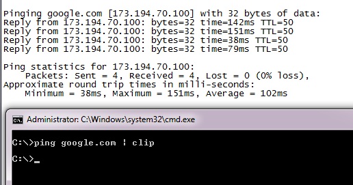 De multe ori vreau sa copiez output-ul unei comenzi, varianta clasica este click dreapta->mark->selectez output-ul->si click stanga, o varianta mult mai rapida este folosirea parametrului „| clip”, de exemplu: