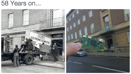 In imaginea din partea stângă se regăsește Elliott 803, fabricat în aproximativ 250 exemplare de către compania britanica Elliott Brothers în anii 1960. In partea dreapta Raspberry Pi Zero un proiect lansat de către Eben Upton în 2012 aflat la a treia versiune, de atunci și pana azi au fost comercializate aproximativ opt milioane.
